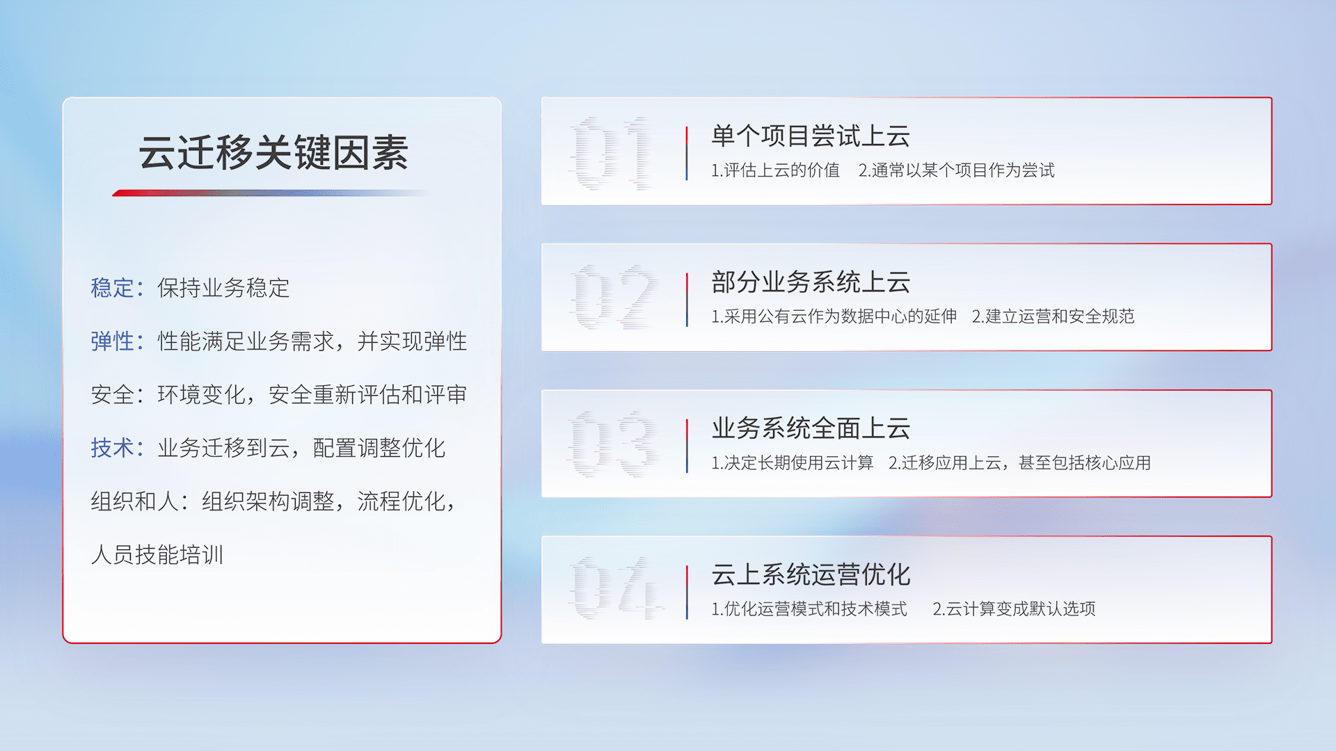 结合实际业务,,,,从规划设计、、、、云平台选型、、云原生改造、、、数据迁移、、、集成交付,,,,迁移全过程为客户识别最佳上云路径,,,,做好风险识别管理,,,设计网络架构、、、、身份权限、、安全审计合规、、、、操作审计、、、日志审计、、、监控告警策略、、、多站点容灾设计等,,,对云上基础设施进行整体规划,,提升IT治理水平,,,以满足弹性、、、高可用、、、、高性能的需求。。。。